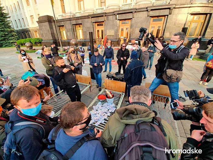 Под Офисом Президента в Киеве проходит акция с фальшивыми деньгами